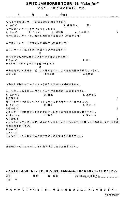 5/7は平日でしかも開演が6:30ということで、会社を早退(ナイショ)して会場へ・・・ 京王線の東府中という駅で下車。てくてく歩いていくと、ありました!ありました!! 結構並んでる。でも指定席だし、ゆっくり入ろうと思って、まわりをブラブラ。 途中で買ったおにぎりを公園で食べて腹ごしらえ(^^) 6:00をちょっと過ぎた頃に入場。 荷物チェックを終えていろんなチラシを受け取りました。ツアーグッズとかスピッツベルゲンの申し込み用紙とか。 席につく前に、グッズ買おうかなと思ってグッズ売り場へ・・・ 「結構混んでるなぁ〜」と思って売り場の前に行ったら「あっちに並ぶんだよ」と言われ 左の方のロビーから階段の方に目をやる・・・・ うげっ!(゚〇゚;) なんだこの行列は!! そうです。ツアーグッズを買うための行列・・・・ これじゃぁ開演しちゃうよぉ〜(;_;) でもぎりぎりまで並んでようと思って列の最後尾にならびました。 意外と早く売り場へ着いたんだけど、それからがまた大変(;_;) ぎゅうぎゅうで買いおわった人と これから買う人がなかなか入れ替われないような状態(;_;) やっとこさ「ビニールバッグ」「キーチェーン」「クリップ」「Tシャツ(メンズ)」「パンフレット」を買ってホールへ。 「二階席かぁ〜(;_;)」とブツブツ言ってたものの実際に席に着くと、二階席の中では特上の位置。 端っこの前から3列めだったんだけど、正面は手すりがあって誰も居なくていい眺めでした。 後から知ったんだけど俺の斜め前が「ゆうみ」さんでした(^^;) ビックリ。 開演は6:30なのに何を勘違いしたにか7:00からと勝手に思い込み、場内が騒ぎはじめた頃、 一曲目はエトランゼだろうな・・・などどと考えながら周りをキョロキョロしてました(^^;) すると突然・・・「♪ボン、ボボーン、ボボン♪」 のわぁ〜(゚o゚)「ウィリー」じゃないかー! あ〜(;_;) 始まりの瞬間を見落としてしまった〜(;_;)(;_;)(;_;)(;_;)(;_;)(;_;) 気を取り直して・・・ う〜ん、一発目が「ウィリー」なんて意外だったなぁ〜となぜか感動〜。急に「ウィリー」が 「俺のベスト1」になってしまった(^^;) 続いて「センチメンタル」 思ってたよりもノリづらい? 会場のみんなも始まったばかりのせいかノリが悪い・・・・と思ったら、なにやらピンクっぽい服を着て、 両手を上に上げて激しく踊るお姉さんを発見! この時、俺、まだ座ってたんだよね。前の手すりに腕を乗せて、「あ〜、楽ちん」とか言って(^^;) そうこうしてるうちに「ミーコとギター」 うぉおおおおおお! ここで、これが、聴けるとはっ!!!!!!! ウルウルもんでした(;_;) 6曲目に、なんと「旅人」 っくぅ〜今回のツアーの選曲はすごいね! ヒバリのこころやらないのかなぁ〜と思ってたけど、 やってくれました(^^) さものお気に入り! マサムネもたむたむもてっちゃんもステージの前の方まで来てはしゃいでました(^^) でも一つ不満が・・・ 「Oh ho〜 」の最後が短かった事・・・(;_;) シングルCDと同じ長さでやって欲しかった(;_;) 続いて「バニーガール」「スーパーノヴァ」「トンガリ’95」「スパイダー」と最高潮に達していました。 で、ラストは「スカーレット」で第一幕は終わり。 続いてアンコール 一曲めは、ぬあんと「トンビ飛べなかった」 またまた意表をつかれました(^^;) この勢いで「愛のしるし」も歌って欲しかったナ。 続いて、「仲良し」ときて、さてラストは「謝々!」かと思ったら 「運命の人」・・・ う〜ん、ラストはやっぱり「謝々!」か「不死身のビーナス」にして欲しかった(;_;) 「♪不死身のビーナス 府中の街 ♪」ってやって欲しかったよぉ〜(;_;) ライブで一度も「不死身のビーナス」聴いたことないから聞いてみたかった・・・・ でも「ヒバリのこころ」「旅人」「ロビンソン」「トンビ飛べなかった」「ミーコとギター」 「ドルフィンラブ」「夢じゃない」が聴けて嬉しかった!! 「ロビンソン」「ヒバリのこころ」「夢じゃない」はラジオとかの話を聞いて、なんとなく歌うって 予想してたけど、やっぱ嬉しい! あ、そうそう。最後にピックとスティックばらまいてました。もちろん二階席には届きません(;_;) 最後は「運命の人」かあ〜・・・と思いながら会場を後にしました。 でも今になって、「運命の人」がラストになった理由がある訳だから、あれで良かったんだ! と思います。「スカーレット」がアンコール前のラストだったのと関連性があるような気がするのは 気のせいかな(^^;) 会場と公園が隣り合わせなので公園へ回ってみました。 うぉ〜! フェンスの先の下の方に、トレーラーが! 横には「SPITZ」の大きな文字が! 奥の方では搬出作業が行われていました。 近づこうとすると警備の人に「これ以上近づかないでください」と言われてしまった(^^;) 「見るだけ!」って抵抗しましたが、ダメでした(;_;) カメラ持ってくれば良かった・・・・(;_;) MCの中でどこか美味しいお店ないかなって言ったら「江川亭」っていう事を言ってました。 実はこの「江川亭」